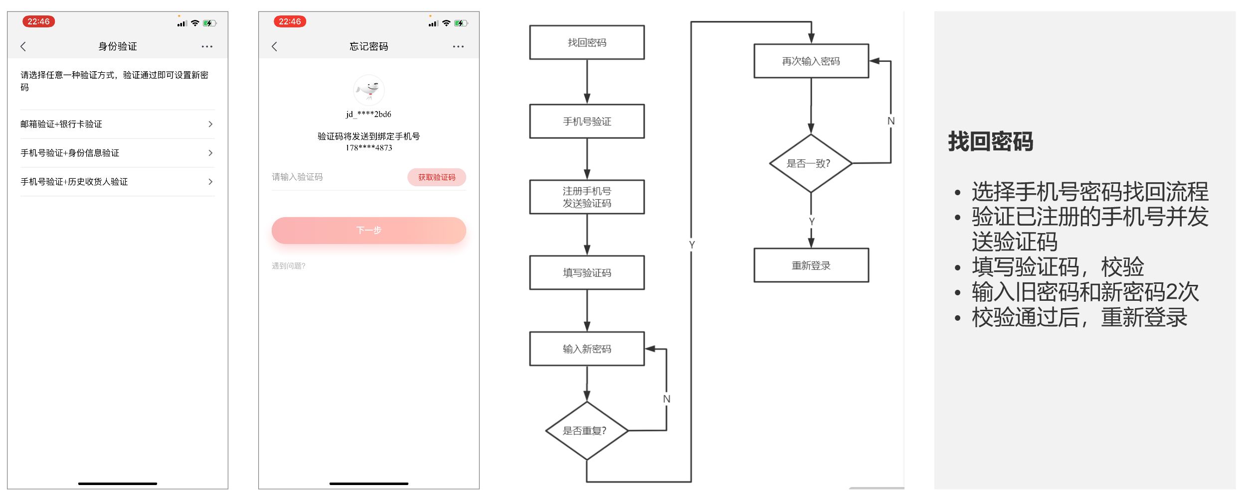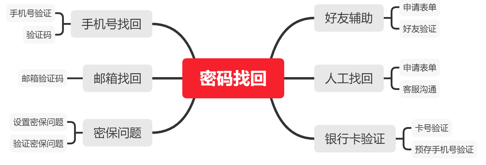 短信验证码:用于注册、登录、密码找回等操作;防刷机制:防止批量创建账号、批量验证账号等恶意操作;异地提醒:不常用地址登录提醒,防止盗号;邮箱激活:邮箱注册方式需要邮箱激活;图形识别码:登录时,设计图形验证码能防止机器人刷;手机号:绑定的有效手机号,进行真伪性验证;IP限制:用于防止恶意的大量注册、登录行为;实名信息:用户真实姓名、身份证、性别等,不可更改。对于这些账号安全措施,密码找回是最常见也是使用频率最高的方式,我们重点介绍一下找回密码的流程。