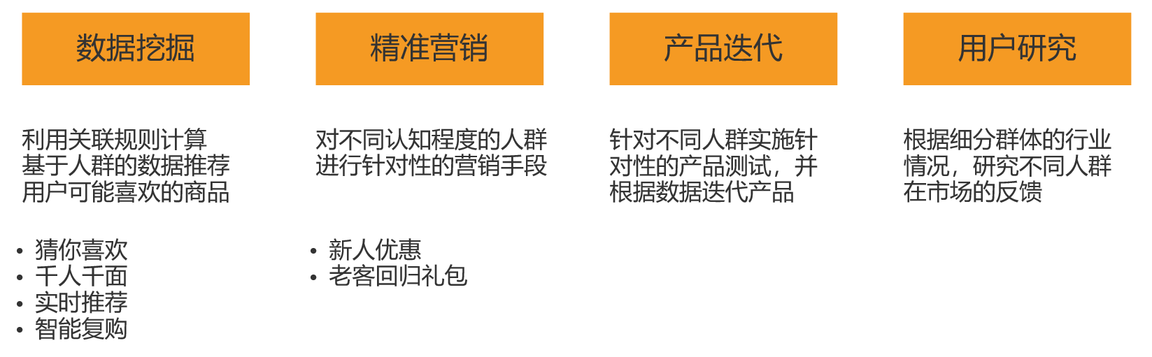 用户画像最基本的应用场景主要有四个:数据挖掘、精准营销、产品迭代、用户研究。