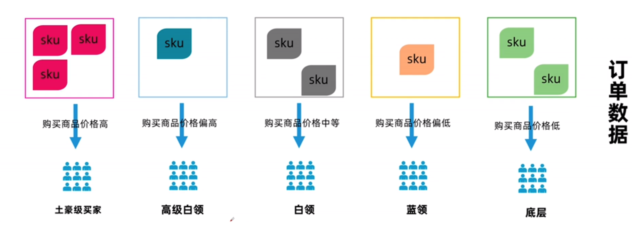建立模型后,即可用此模型评估用户的购买力。我们根据用户购买商品价格的高低,将用户分为土豪级买家、高级白领、白领、蓝领、底层。