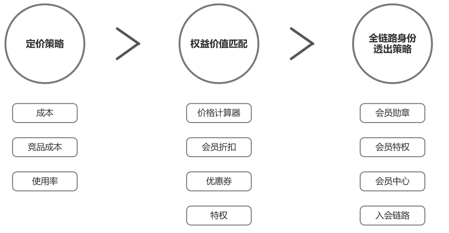 最后,在设计付费会员产品时,我们需要从定价策略、权益价值匹配、全链路身份透出策略三个方面去考虑。