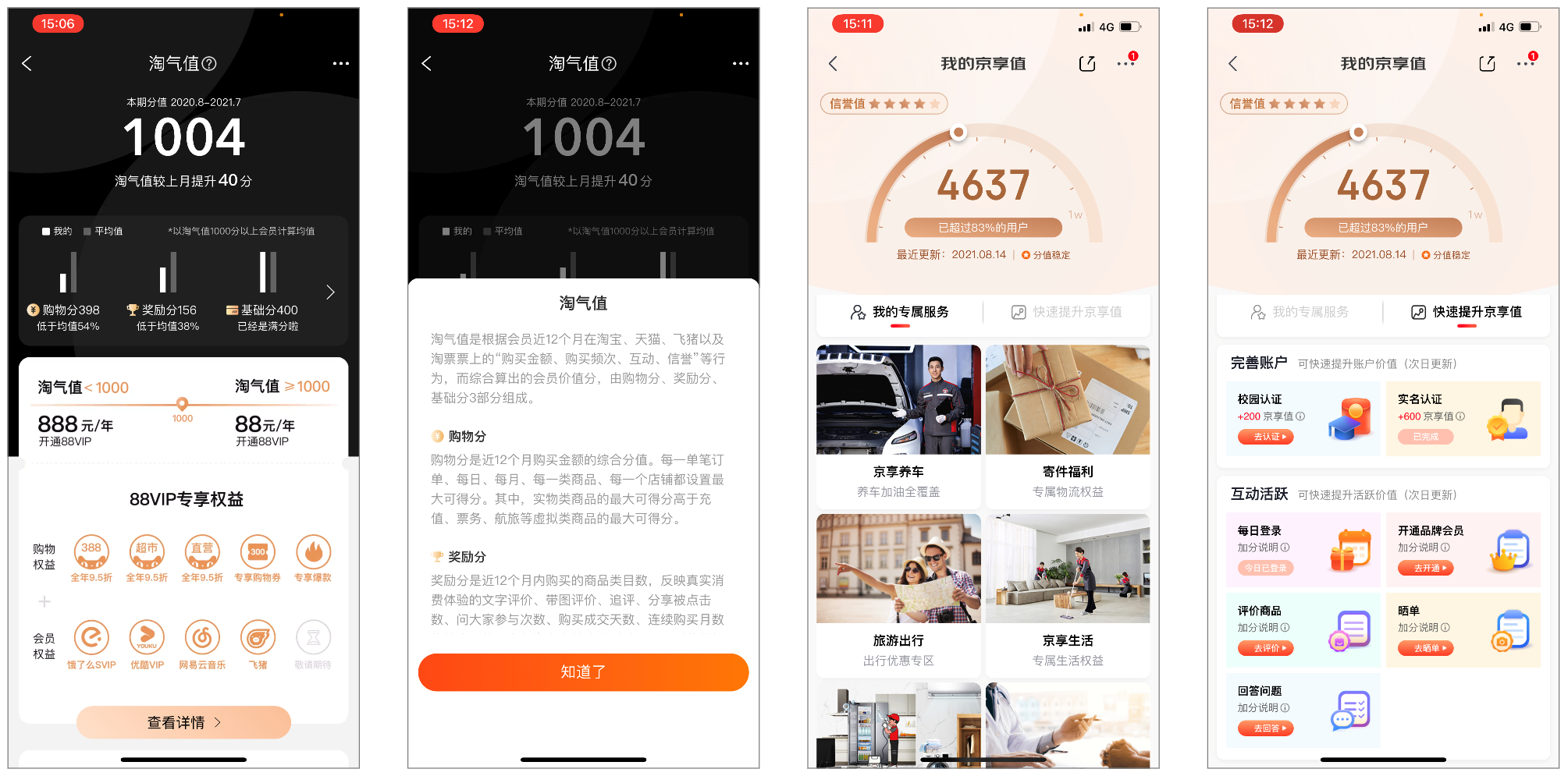 购物,购物获取一定分数,但是有次数限制;互动,通过一些玩法获取成长值;基本资料,日常行为和资料完善可增加成长值;信誉评级,如购物履约行为,购物合规行为均会影响评级,评级越高则成长值越高。3)成长值变化: