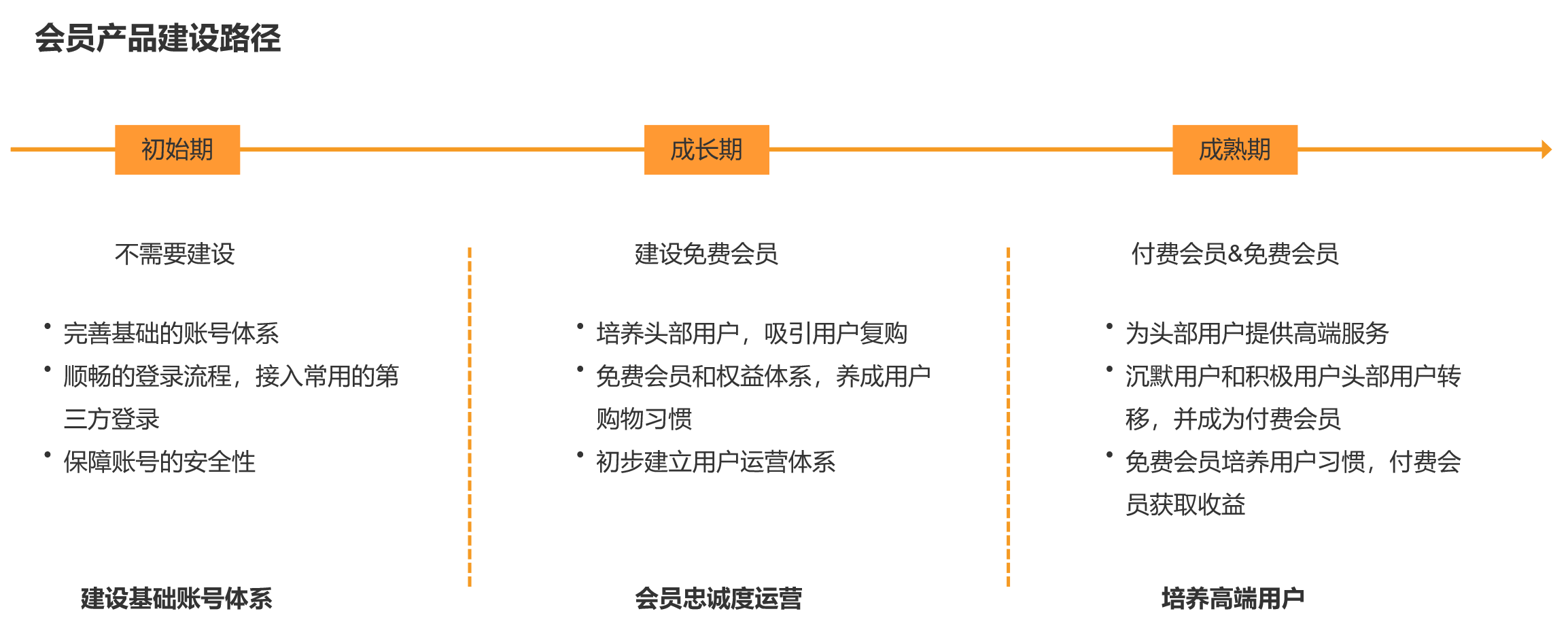 我们以电商产品的发展时间为区分,将其分为初始期、成长期、成熟期三个时期。在产品初期,我们应该重点建设基础账号体系。到了电商产品的成长期,我们就可以先引入免费会员,进行会员忠诚度运营。而当电商产品进入成熟期后,我们就可以同时引入付费会员和免费会员体系,大力建设与完善会员产品,培养高端用户。