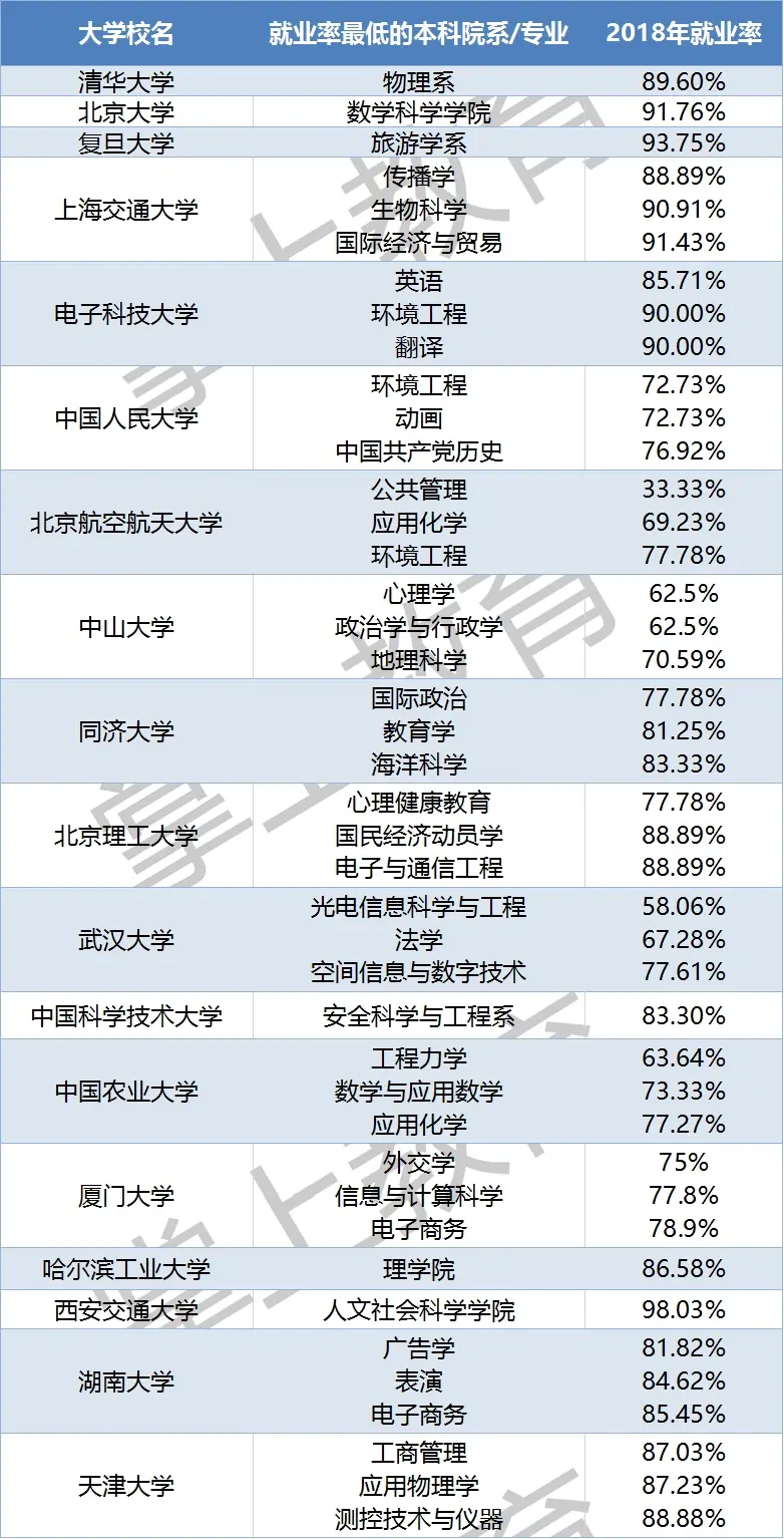 如下图是部分985大学去年就业率最低的专业,可以看出,除了环境工程、法学等专业外,动画、公共管理、心理学等专业在985大学中的就业率同样也不高。