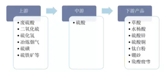 硫酸是一种无机化合物,一种具有极强腐蚀性的化学品,分类为易制爆化学品和易制毒化学品。硫酸行业产业链上游主要为废硫酸、二氧化硫、硫化氢、硫铁矿等,下游产品主要有草酸、钛白粉、硫酸铵、硫酸锌、硫酸铜等。