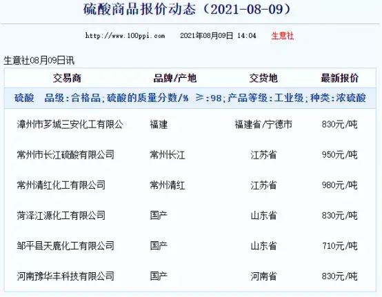 硫酸价格同比大涨4倍!行业龙头和产能前10名单曝光