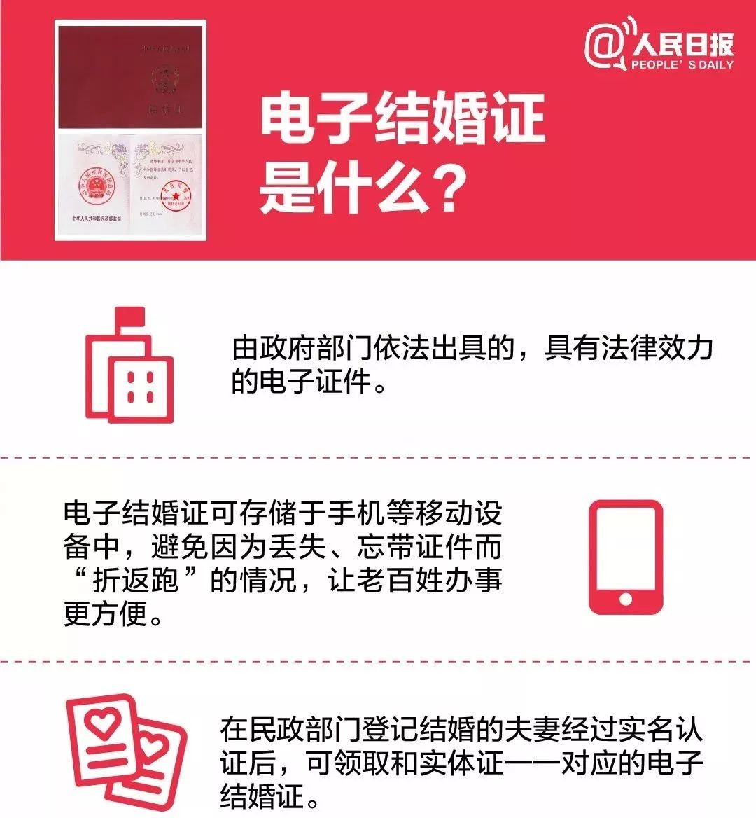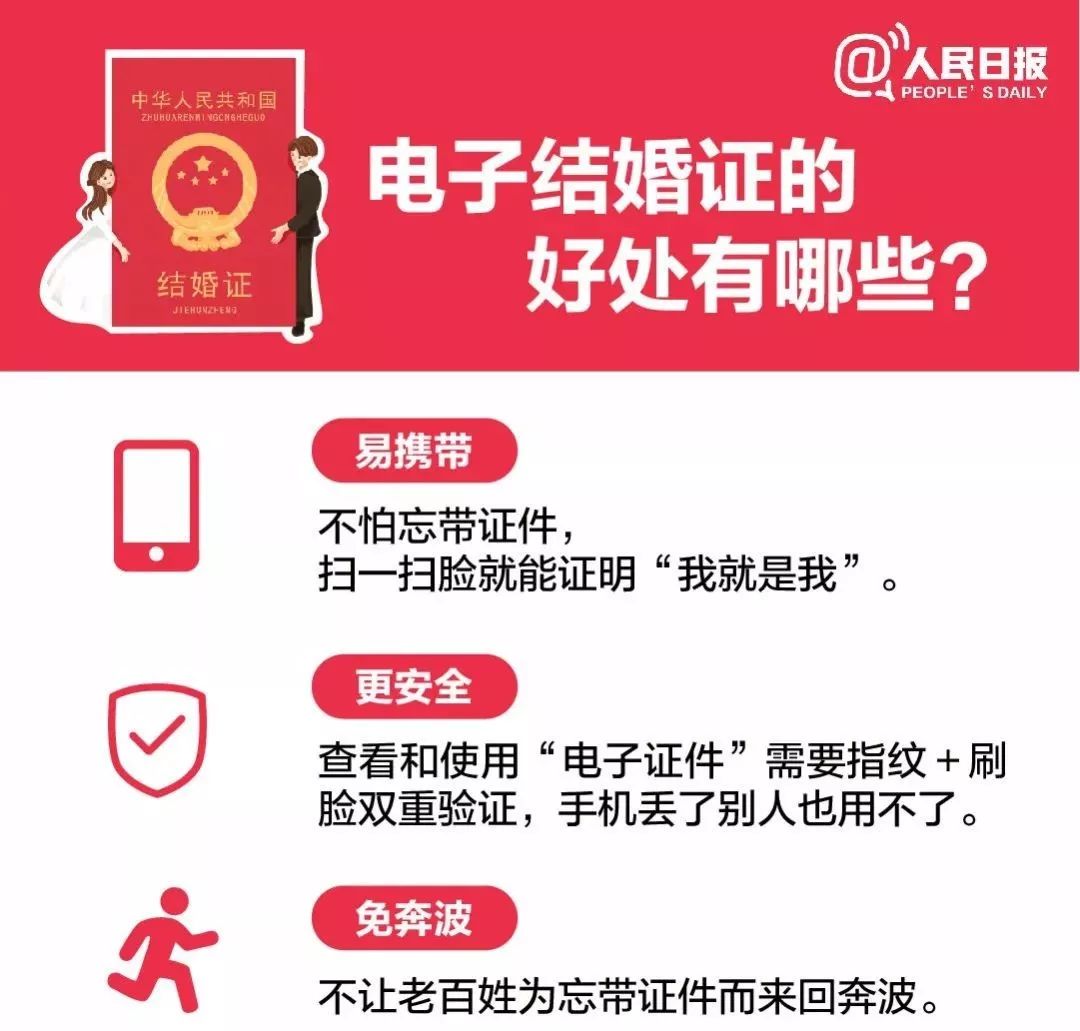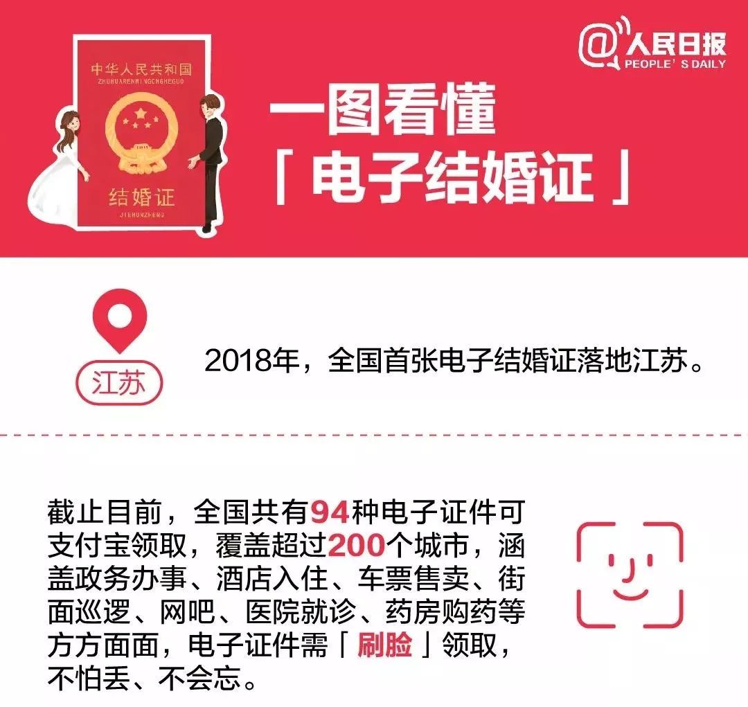 今年8月,浙江、江苏、江西、福建、重庆五省市率先宣布,可在支付宝领取电子结婚证。电子结婚证和实体结婚证相对应,已登记领证的市民可在线刷脸领取电子证,在购房贷款、财产公证等业务中使用。