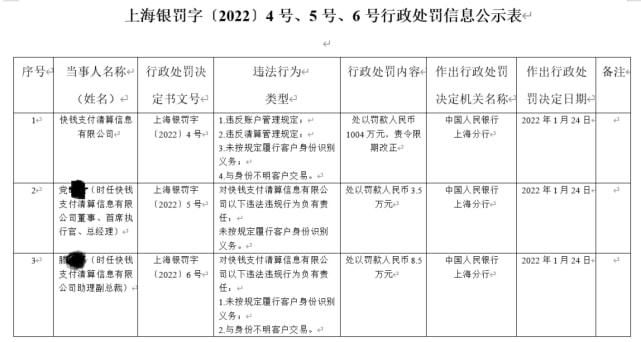 2月7日,中国人民银行上海总部官网公布的上海银罚字(2022)4号、5号、6号行政处罚信息公示表显示,快钱支付因违反账户管理规定、违反清算管理规定、未按规定履行客户身份识别义务、与身份不明客户交易,于2022年1月24日被中国人民银行上海分行处以罚款人民币1004万元,并责令限期改正。