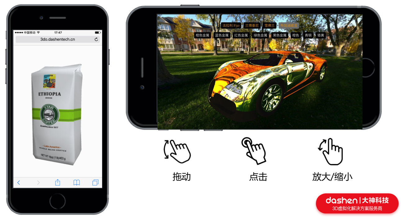 三维的表现形式,能够全方位的展现商品,具有二维平面图象不可比拟的优势。具有互动操作的三维商品,顾客观察和操作后,能够对产品有更加全面的了解,决定购买的几率会大幅增加。