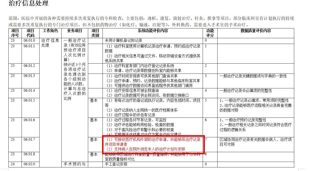 “治疗信息处理”工作角色中,一般治疗记录业务项目,系统功能评价内容:可接收医疗机构外部的治疗申请,并能够将治疗记录传送回申请者,支持病人在院外浏览本人的治疗计划与安排;数据质量评价内容:区域协同治疗记录有关数据中病人、治疗项目可对照。