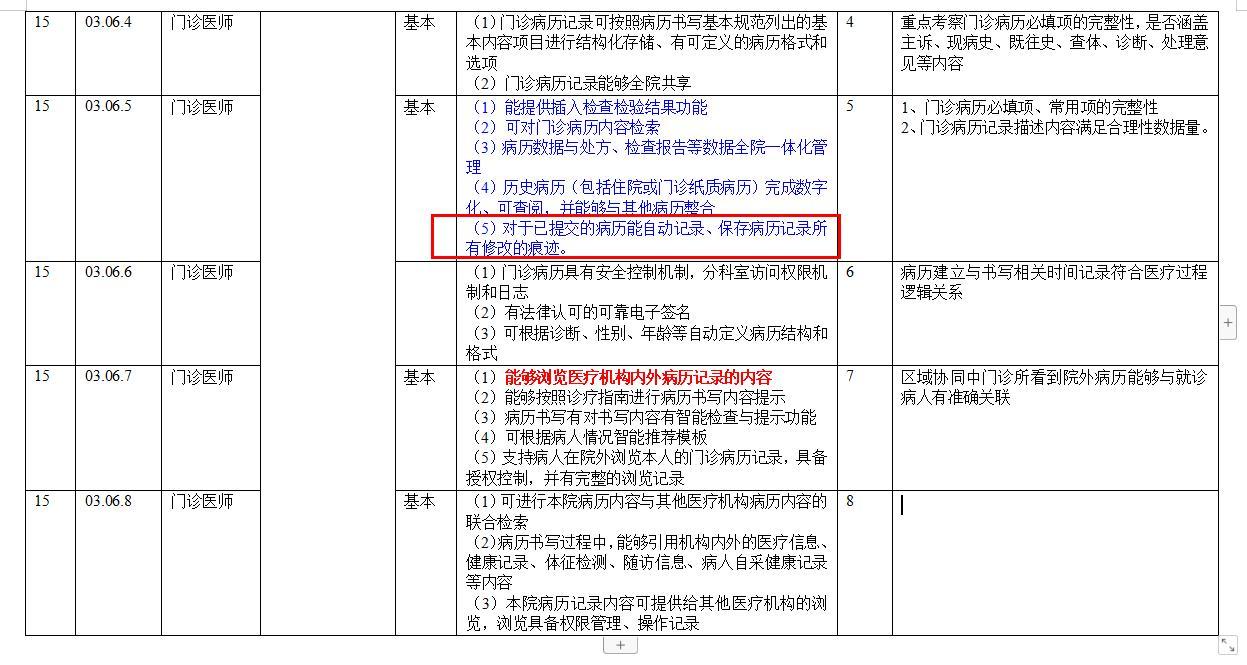 门诊病历业务主要评价内容:(1)能提供插入检查检验结果功能(2)可对门诊病历内容检索(3)病历数据与处方、检查报告等数据全院一体化管理(4)历史病历(包括住院或门诊纸质病历)完成数字化、可查阅,并能够与其他病历整合(5)对于已提交的病历能自动记录、病历记录所有修改的痕迹。