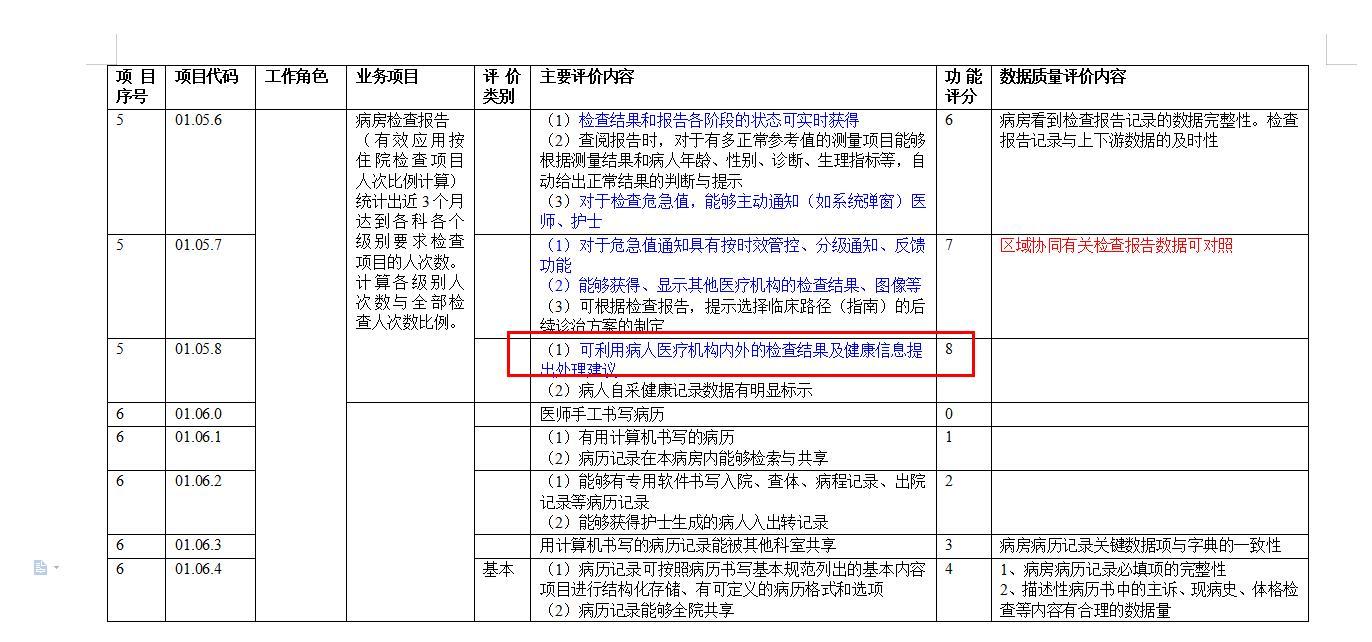 病房检查报告业务项目,主要评价内容:1)检查结果和报告各阶段的状态可实时获得 对于检查危急值,能够主动通知(如系统弹窗);医师、护士:(1)对于危急值通知具有按时效管控、分级通知、反馈功能 (2)能够获得、显示其他医疗机构的检查结果、图像等,(1)可利用病人医疗机构内外的检查结果及健康信息提出处理建议,数据质量评价内容:区域协同有关检查报告数据可对照。