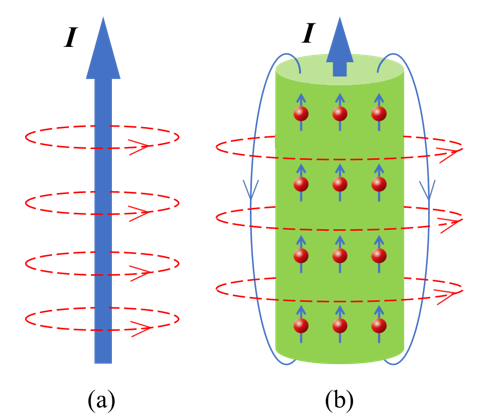在电磁学中,一个电流产生的磁场如图3(a)所示。在自旋电子学中,一个自旋极化的电流产生的磁场如图3(b)所示,除了常规电流产生的环形磁场外,还会伴随着一个电子自旋极化导致的有效磁场,其与电流密度、自旋极化方向和自旋极化率等参数有关。