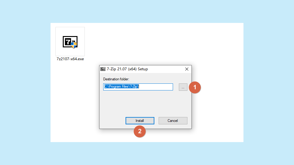下载完成后,默认保存的文件名是【7z2107-x64.exe】,双击打开或点击右键选择【以管理员身份运行】,在打开的窗口中可以点击右边的【...】自定义安装路径。如果没有特别的需求,默认的安装路径就很规范,可以直接点击【Install】。