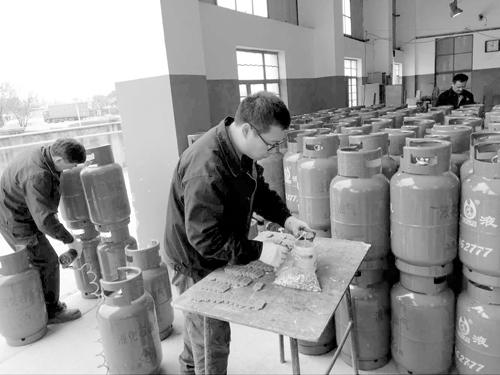 图为上海液化气经营有限公司浦东新区储配中心工作人员正在给新气瓶贴上电子标签。