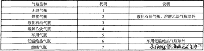 表示不同形式或适用于充装不同介质的气瓶的代码,批评品种码应符合下表规定。