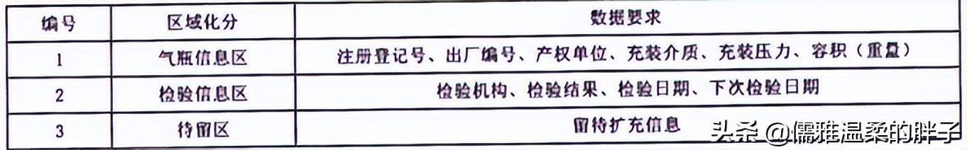 标签内存岀的信息应由气瓶信息区、检验信息区、待留区三部分组成,各部分的数据应符合表2要求: