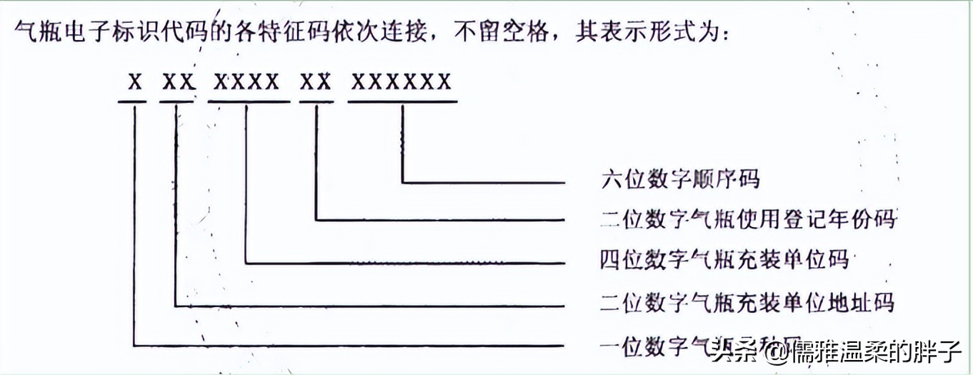 SJT 11532.1-2015 《危险化学品气瓶标识用电子标签通用技术要求 第1部分:气瓶电子标识代码》气瓶电子标识代码和特征组合码,由15位数字代码组成。排列顺序从左到由依次为:一位气瓶品种码,二位气瓶充装单位地址码,四位气瓶充装单位码,二位气瓶使用登记年份码和六位顺序码。
