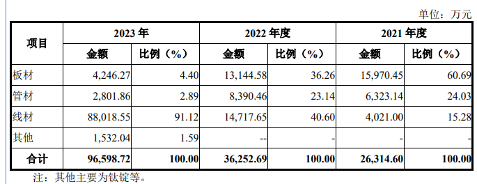 根据招股书资料显示,天工股份所经营的钛及钛合金材料产品主要分为板材、管材和线材,板材和管材更多应用于化工能源、冶金等领域,而线材主要用在消费电子产品、3D打印、医疗器械、休闲生活等。过去,在传统化工能源快速增长下,公司板材和管材的业务占比也较大,而以消费电子产品等应用为主的线材业务收入较小。