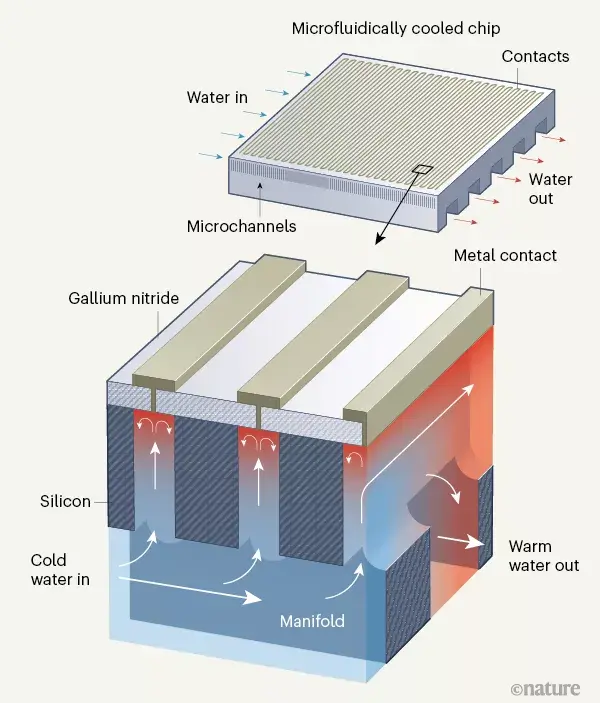 图 | 微芯片内的集成液体冷却系统(来源:Nature)