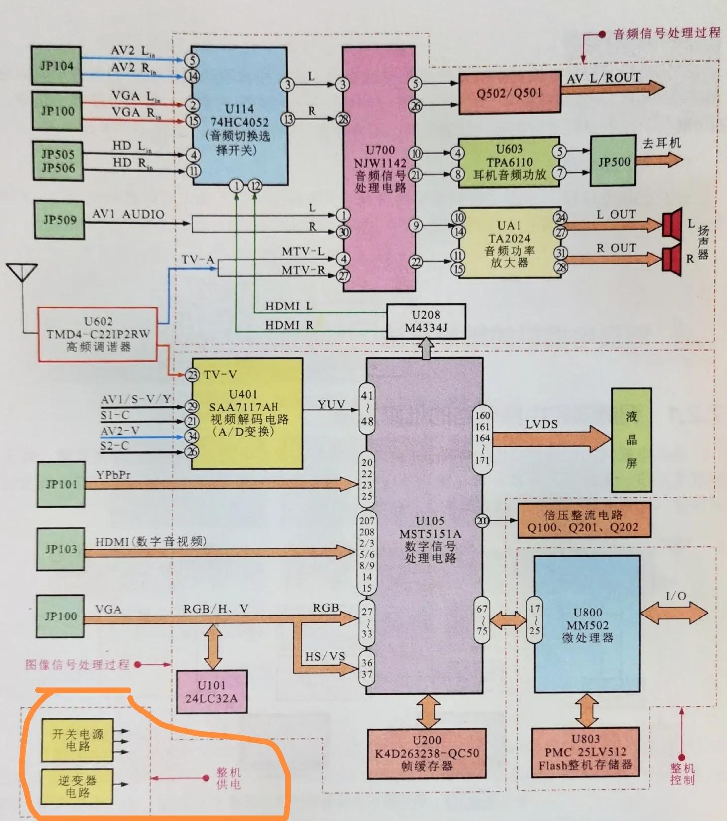 液晶电视机的整机工作过程非常复杂,但现在我们弄清了液晶电视机的结构特点后,再从整机角度了解信号主线,可从整机结构图入手,我们分四条主线去掌握主要信号线路及功能电路的关系。如下图所示。