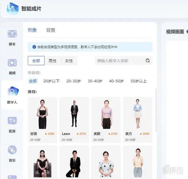 比如在智能成片功能中,用户选择在十几个数字人中选中一个形象,就可以用这个形象生成需要的视频,从而免去了拍摄和剪辑的过程。