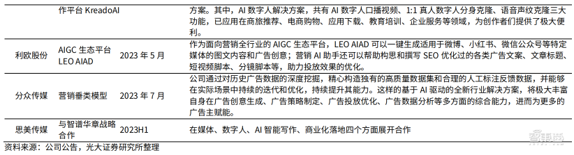 2023年部分营销服务商AI+广告营销布局(图源光大证券)