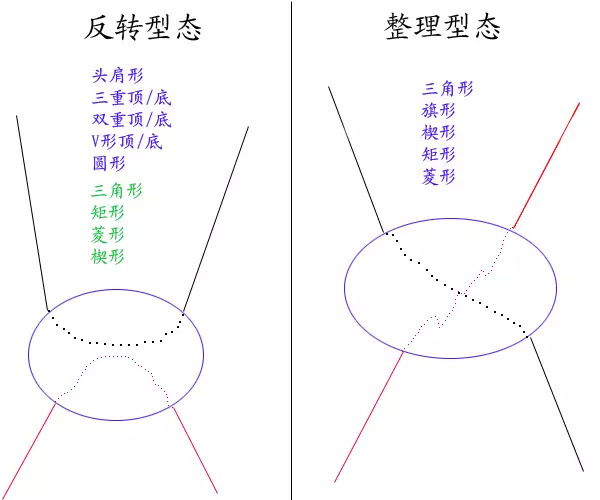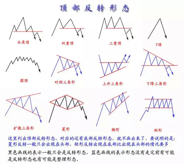 反转形态: 头肩型 三重顶与底,双重顶与底,V型顶与底,圆型 还有 三角形,菱形,楔形,矩形