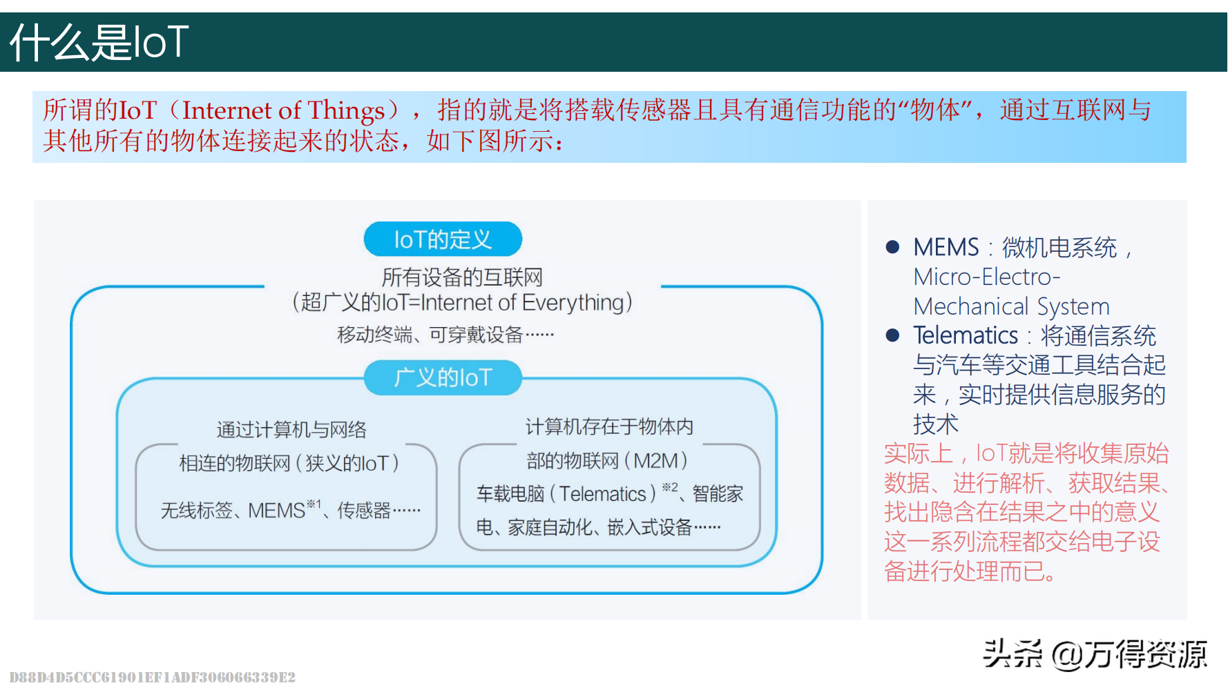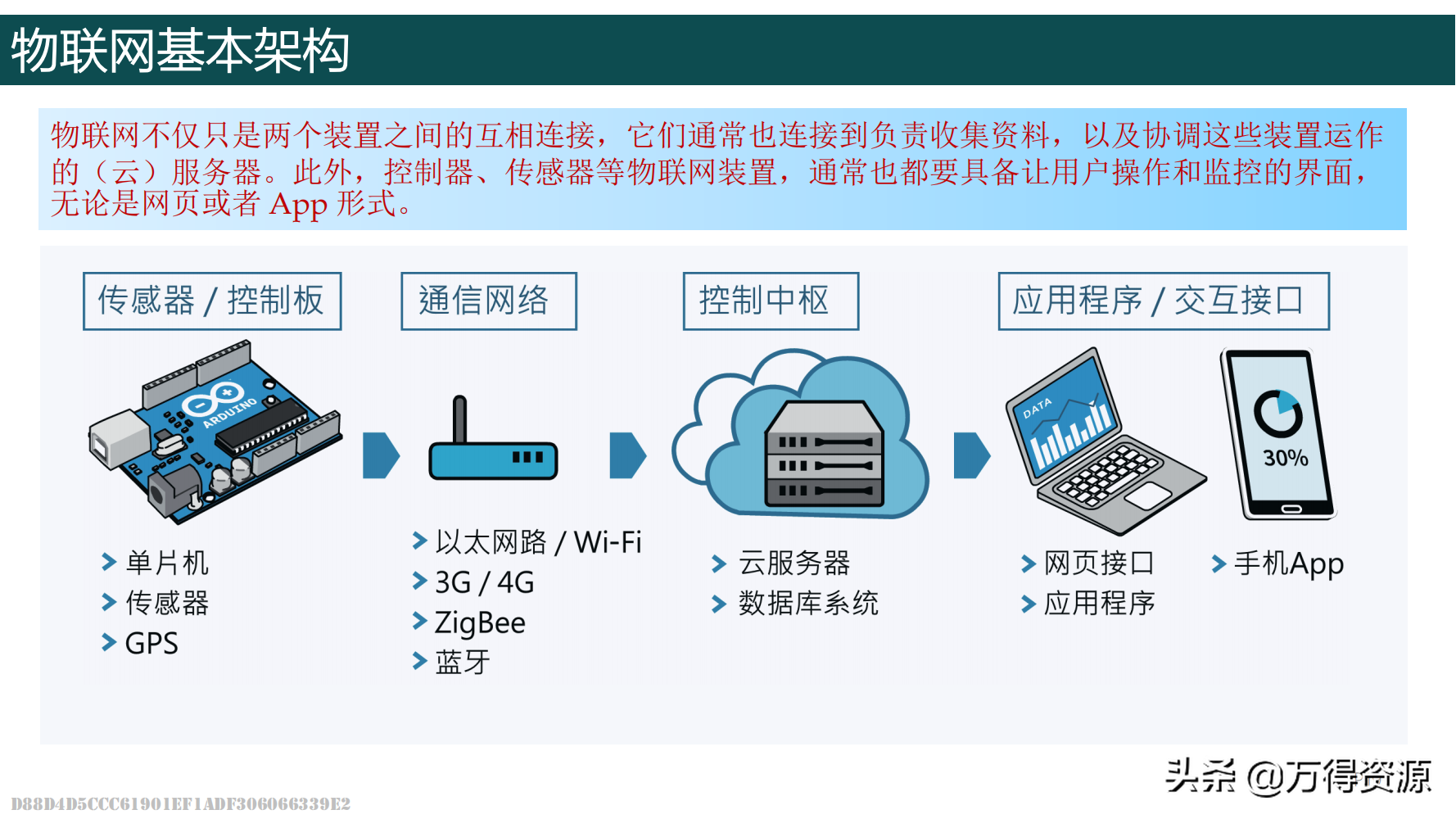 物联网的英文名为“the Internet of things”,简称IoT。它是将各种信息传感设备与互联网结合起来而形成的巨大网络,也是继计算机、互联网与移动通信网之后的又一次信息产业浪潮。物联网主要通过射频识别、红外感应器、全球定位系统、激光扫描器等信息传感设备,按约定的协议将所有的“物”(小到手表、钥匙,大到汽车、楼房等)与互联网相连,进行信息交换和通信,以实现对物品的智能化识别、定位、跟踪、监控和管理。