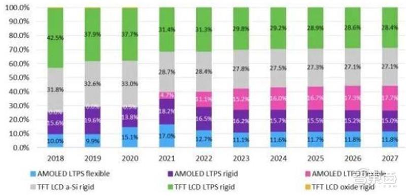 2018-2027年各技术的智能手机显示屏占比情况