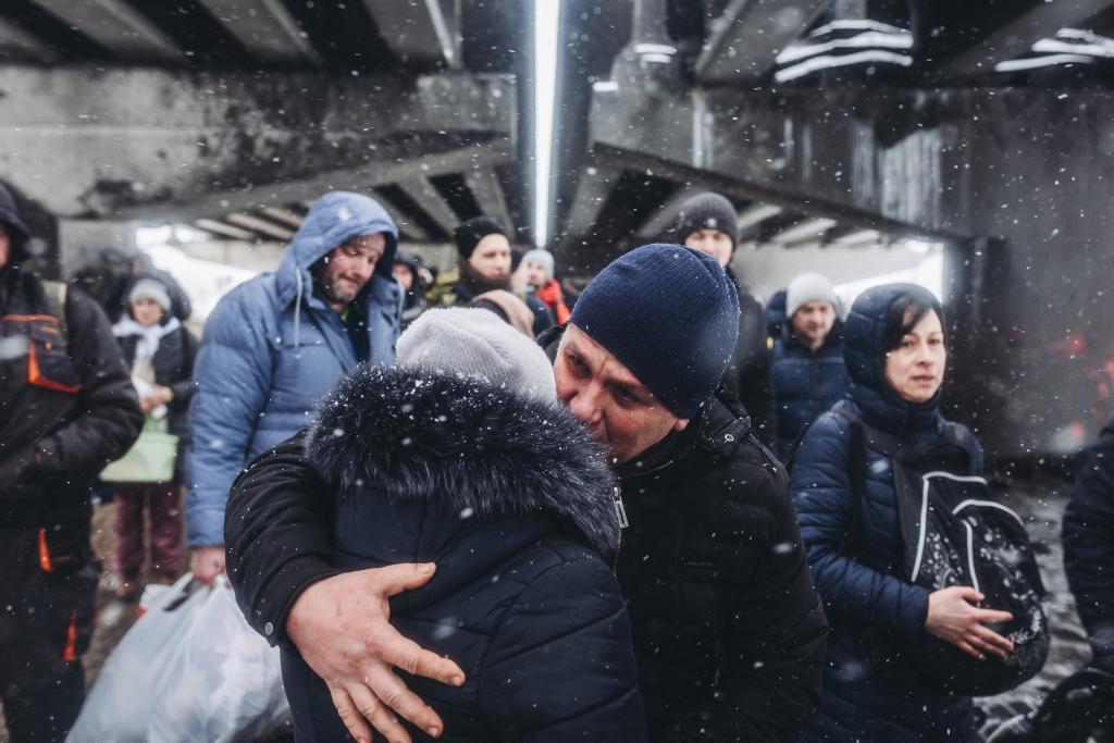 2022年3月8日,一对情侣在乌克兰伊尔平告别。俄方3月9日在乌克兰多个城市实行“安静模式”并开放人道主义通道。新华社发(迭戈·埃雷拉摄)