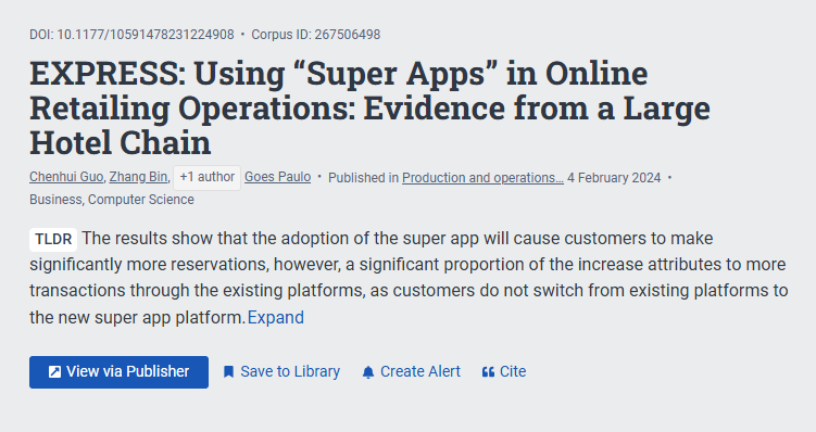 近日,浙江大学管理学院陈熹携手多位合作者,聚焦数字经济时代新兴零售市场领域的具体问题,在国际顶级期刊《Production and Operations Management》(UTD 24) 上发表了他们的研究成果“Using‘Super Apps’ in Online Retailing Operations: Evidence From a Large Hotel Chain”。