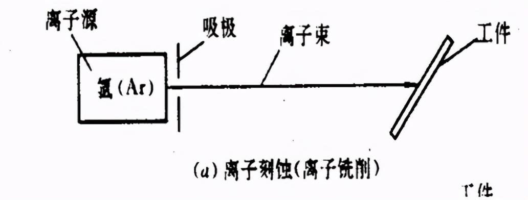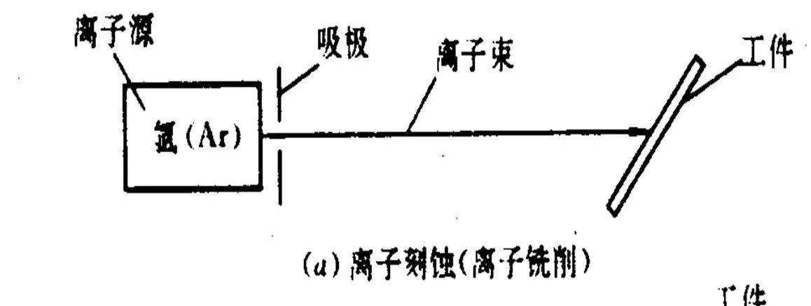 采用能量为0.1~5keV、直径为十分之几纳米的的氩离子轰击工件表面时,此高能离子所传递的能量超过工件表面原子(或分子)间键合力时,材料表面的原子(或分子)被逐个溅射出来,以达到加工目的。这种加工本质上属于一种原子尺度的切削加工,通常又称为离子铣削。
