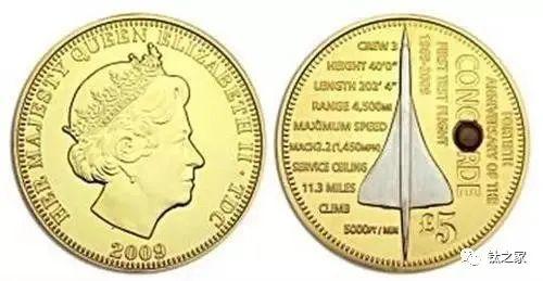 特里斯坦-达库尼亚群岛带有小块协和飞机钛合金的硬币。这枚硬币是为了纪念协和式飞机首航40周年,在2009年铸造的。硬币表层镀金,每面都含有一小块从协和飞机上取下的钛合金,将所有硬币收集起来,你就可以建造一架迷你型和协式飞机了。