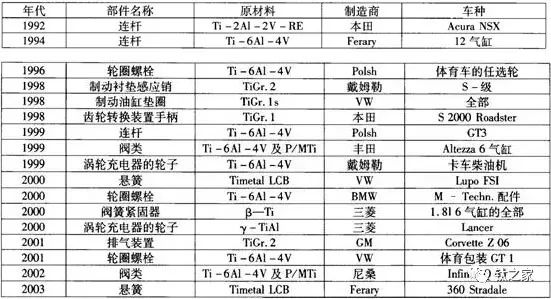 日本早在20年前就把钛应用于赛车及一部分跑车,但尚未用于重视成本的一般小客车。如日产汽车R382因采用了钛合金制汽门,在日本大赛中获胜。目前,钛及其合金在汽车上的应用主要有发动机部件弹簧,车杆,连杆,标准件,车轮,动力阀等。据日本的经验,在汽车动力阀使用0.8~0.9kg/台的钛相当于减重20kg/台的效果。