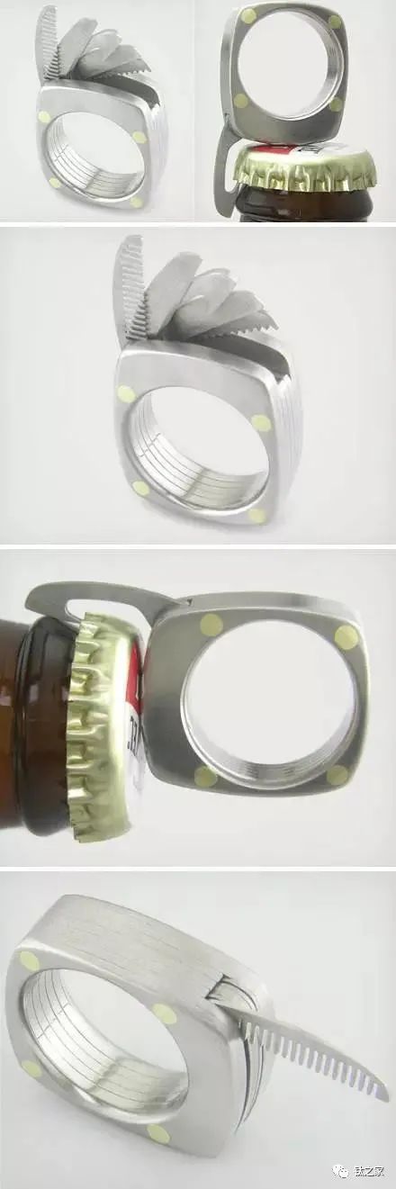工具戒指采用钛合金材质制作,你可以将之看做戒指中的瑞士军刀——戒指的顶端隐藏了四个小工具在里面,分别是开瓶器、小刀、锯子,和一把小梳子。