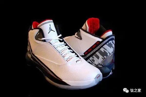 乔丹第22代球鞋,其外露式互换型承轴柱可以适应两种缓震系统.加强的钛合金鞋骨承托板为双脚中部和足弓提供支撑。此款球鞋的设计收F-22战机的启发。