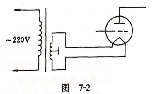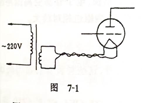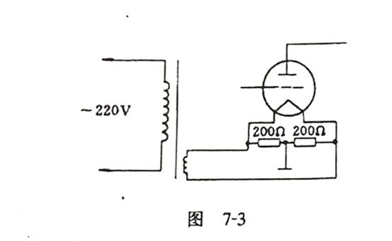 图 7-2是一种在电源变压器灯丝线圈绕组中设置中心抽头并使中心抽头接地的供电方式。利用两组灯丝绕组的方向相反来将交流干扰电场相互抵消。