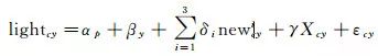 式中,lightcy是城市c在年份为y时的基于夜光提取的建成区扩张方向变动指标;αp是省固定效应,作为控制变量控制不同省份的固有差异;βr是年份固定效应,作为控制变量控制某一年份的固有差异(若控制省份之后回归结果依然显著,则说明省份变量并没有干扰结论,可以证明结论的稳健性,年份固定效应同理);newcyi为3.1节中构建的政策因素变量,用主政官员在任的情况作为替代变量(顾及主政官员改变政策之后,再到城市扩张方向实际发生变化,这期间存在滞后效应,故此将官员在任时间分为3档:当i=1时,表示y年是城市c的市委书记(或市长)上任当年或上任后第1年;当i=2时,表示y年是城市c的市委书记(或市长)上任后第2年或第3年;当i=3时,则表示y年是城市c的市委书记(或市长)上任后第4年或第5年);xcy是控制变量,用于控制城市本身的发展阶段和工业发达程度等固有因素;εcy是随机扰动项;核心系数是δi,它衡量了城市主政官员变量对城市空间扩张的影响程度。最终,基于本文的归因模型,采用回归分析的方法进行统计分析和显著性检验。