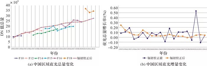 校正后1992-2012年DMSP/OLS中国区域夜光总量和增量如图 3所示。