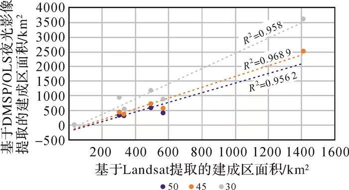 km2城市基于Landsat影像基于DMSP(阈值50)基于DMSP(阈值45)基于DMSP(阈值30)成都301.29333.80452.65954.96武汉564.157418.34572.716893.87北京1 410.762 224.082 520.623 629.91郑州329.81320.89376.92556.18南京491.05594.13740.201 189.68乐山30.8120.8620.8620.86再将基于夜光影像和Landsat影像提取的建成区面积进行线性回归分析,结果如图 4所示。