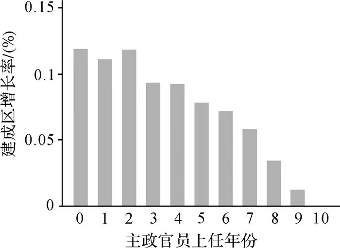 (1) 从建成区增长率来看,城市建成区面积增长率随着主政官员任期的年限增加,出现显著的逐年下降趋势,如图 5所示。这说明地方主政官员上任初期比在任后期要显著地更加热衷于城市建设。