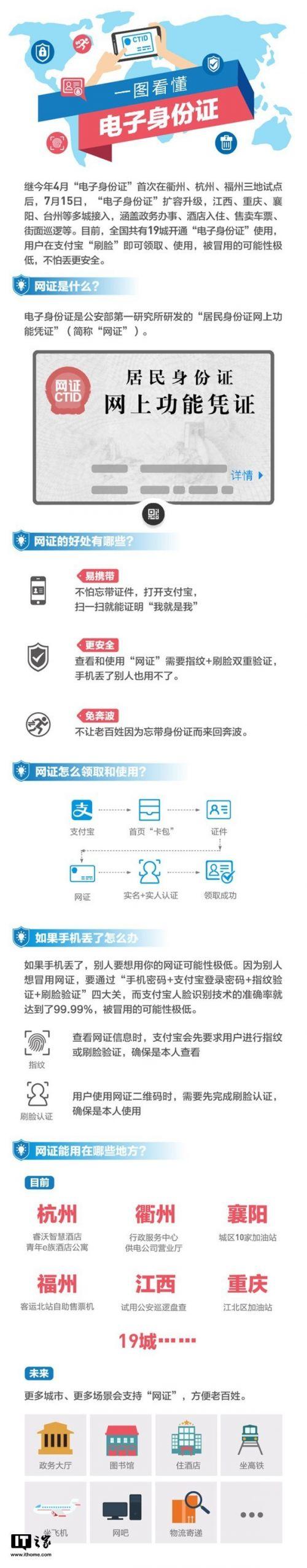 近日,支付宝推出“电子身份证”,这是经过公安部第一研究所可信身份认证平台(CTID)认证的“居民身份证网上功能凭证”,该研究所也是居民二代身份证的发放单位。目前,支付宝的“电子身份证”已经在江西11城、重庆、襄阳、台州等城市开始试点。