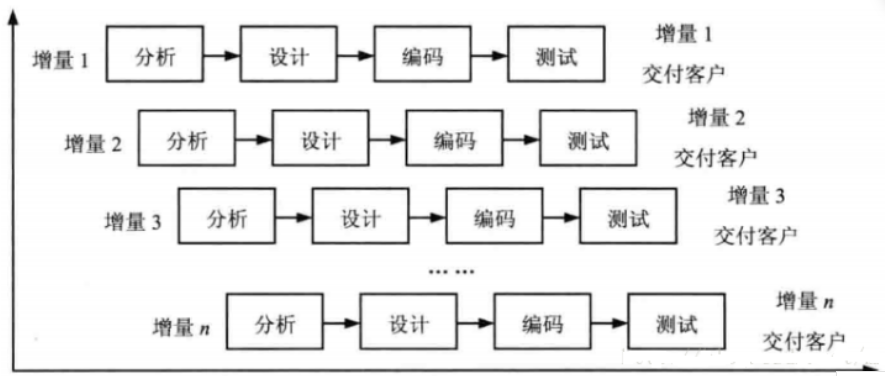 3)增量模型:融合了瀑布模型的基本成分和原型实现的迭代特征,它假设可以将需求分段为一系列增量产品,每一增量可以分别开发。