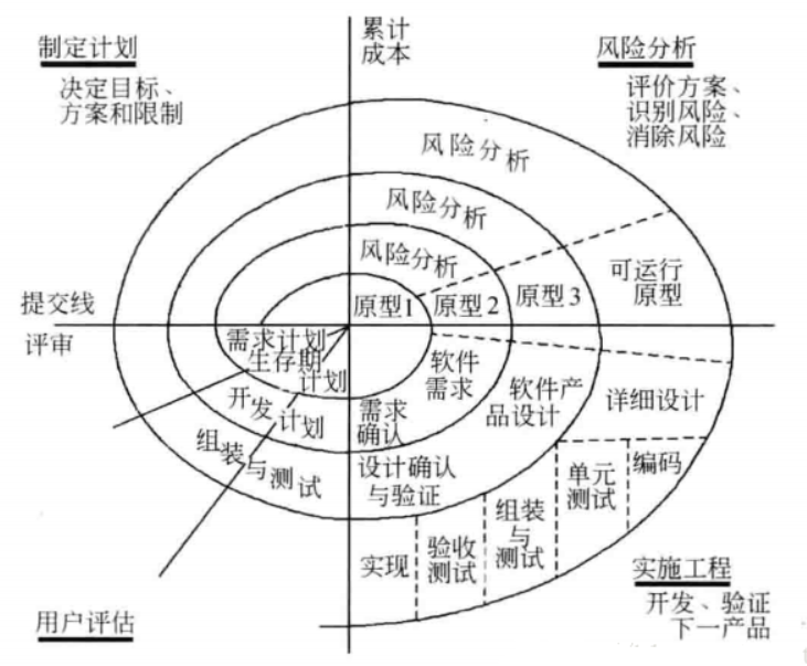 4.2)演化型模型之螺旋模型:将瀑布模型与演化模型结合起来,加入了两种模型均忽略的风险分析,弥补了这两种模型的不足。螺旋模型将开发过程分为几个螺旋周期,每个螺旋周期大致和瀑布模型相符合: