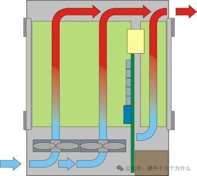 当业务确定之后,需要根据整机的使用场景,确定整机的电源输入的特性,整体功耗的需求,以及散热条件。电源需要考虑一次电源转换为二次电源的能力。散热需要考虑风道是否合理,不同槽位的单板散热的差异,风扇失效模型等等。整机风道如图所示。