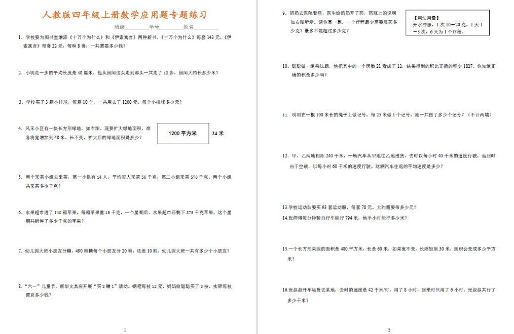 四年级数学上册应用题100道,快给孩子练习吧