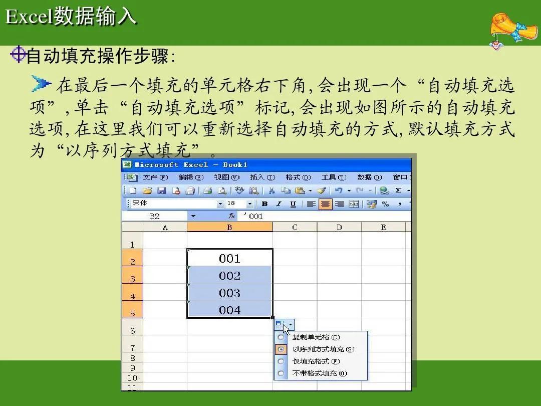Excel数据输入 自动填充操作步骤: 在最后一个填充的单元格右下角,会出现一个“自动填充选 项”,单击“自动填充选项”标记,会出现如图所示的自动填充 选项,在这里我们可以重新选择自动填充的方式,默认填充方式 为“以序列方式填充”。