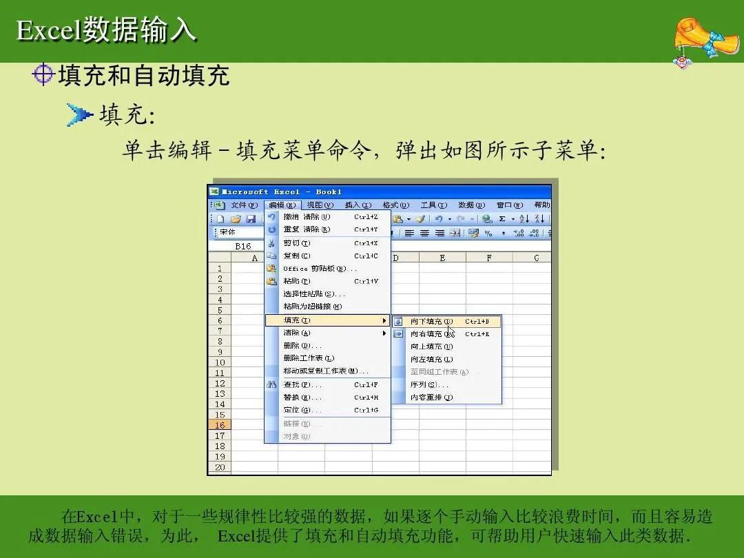 Excel数据输入 填充和自动填充 填充: 单击编辑-填充菜单命令,弹出如图所示子菜单: