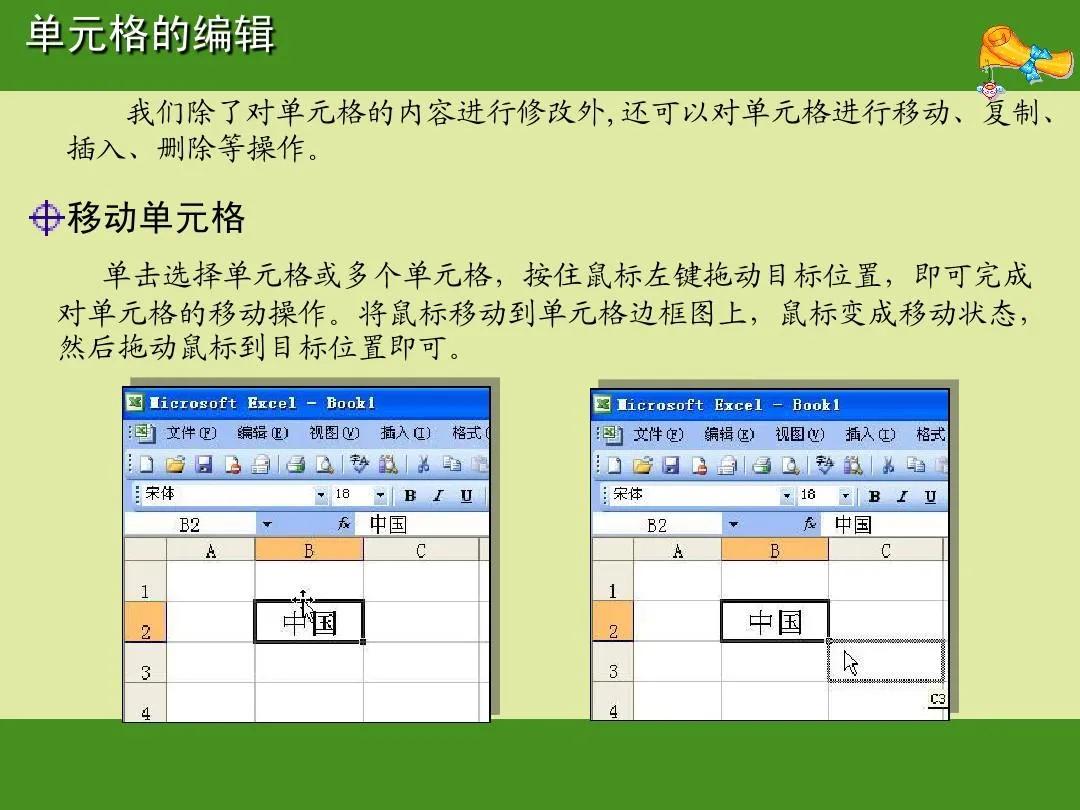 单元格的编辑 我们除了对单元格的内容进行修改外,还可以对单元格进行移动、复制、 插入、删除等操作。