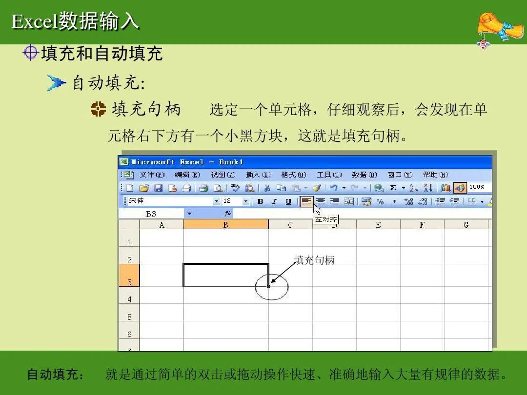 Excel数据输入 填充和自动填充 自动填充: 填充句柄 选定一个单元格,仔细观察后,会发现在单 元格右下方有一个小黑方块,这就是填充句柄。